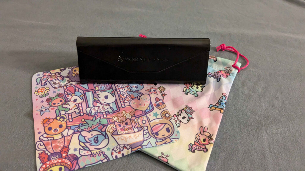 The case is unique as well. I had a lot of qualms with the last tokidoki collab case in Year of the Dragon. I wanted something unique, but not old-fashioned or super “girly”. While the glasses are very feminine (and that’s okay), the case is a unique and interesting triangular shape, complete with a magnetic enclosure.